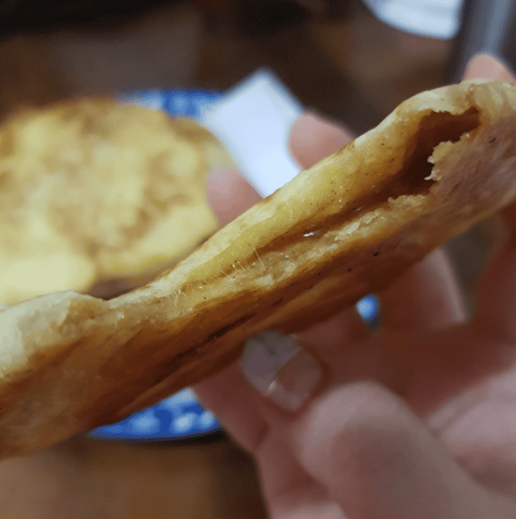 These golden pancakes are stuffed with brown sugar, cinnamon, and crushed nuts. When you take a bite, the hot syrup oozes out – sweet heaven in your hands!
